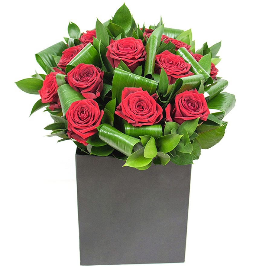 Embrace the graceful elegance of our red roses, combined with fresh aspidistra leaves and stylish ruscus. This beautifully arranged bouquet introduces refinement and beauty to any setting.